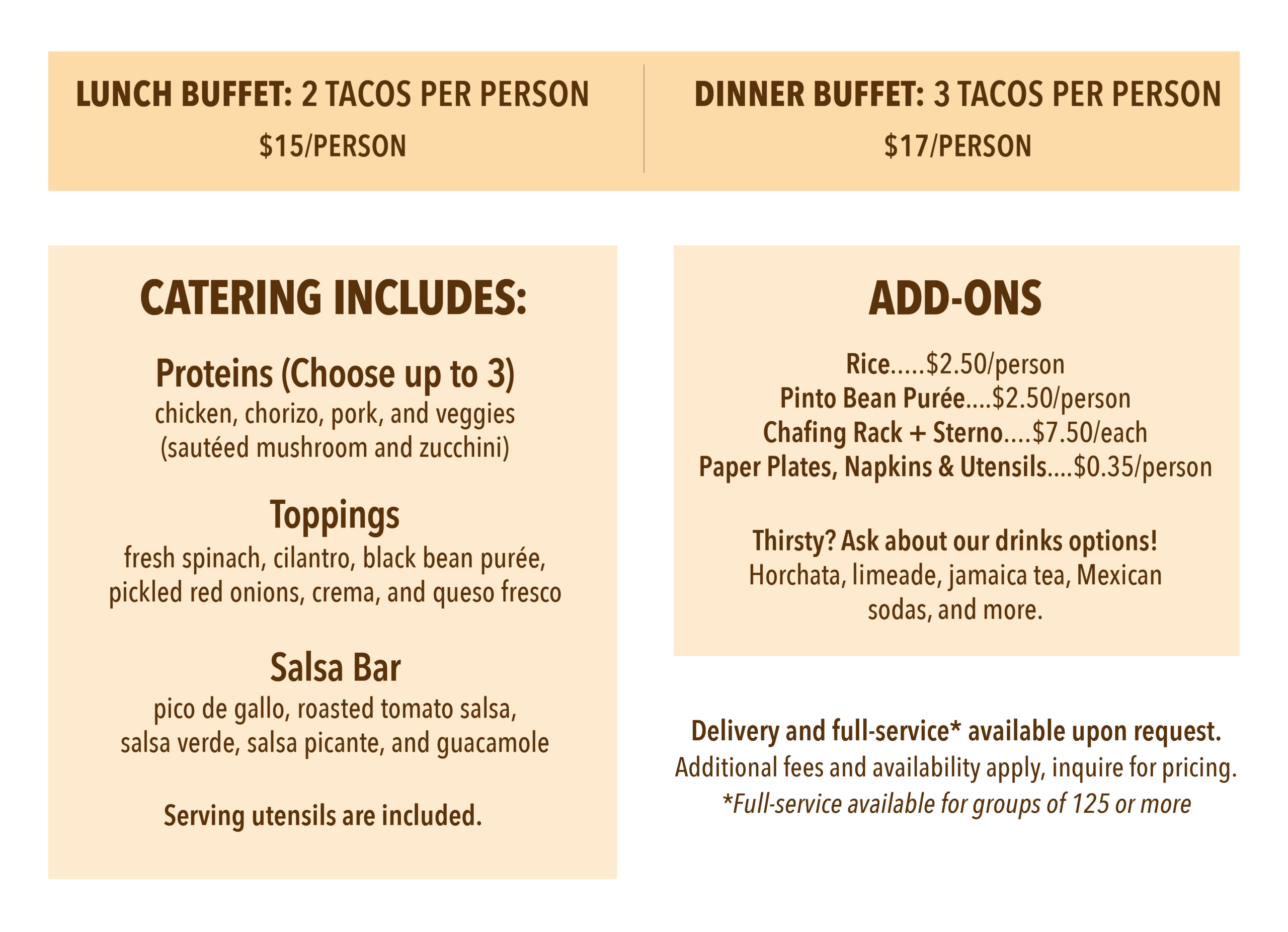 Your order will come with all serving utensils for the buffet line, soft corn tacos, corn tostadas, your three proteins selected, and 11 fresh toppings/salsas.